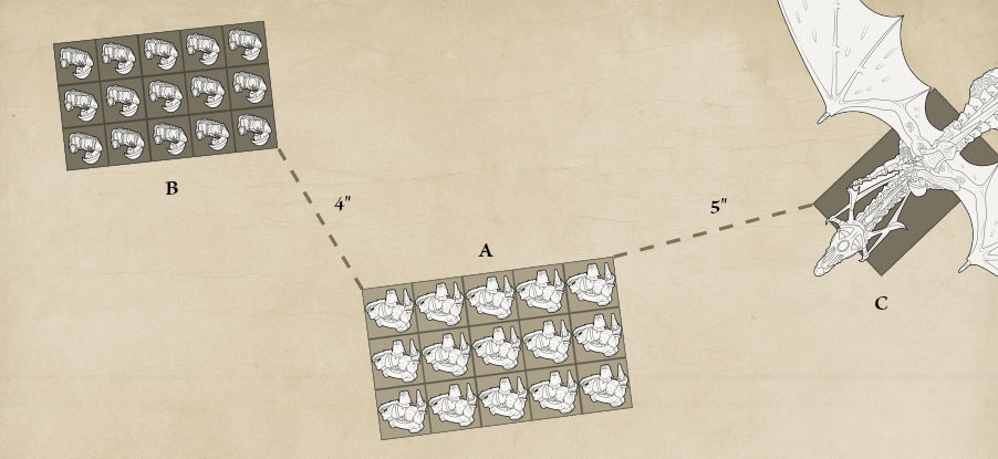 In games of Warhammer: the Old World, all distances are measured in inches ("), using a ruler or tape measure, and can be measured at any time. Distances between models and all other objects (which can be other models, terrain features and so on) are always measured from the closest point on one base to the closest point on the other base (see diagram below).