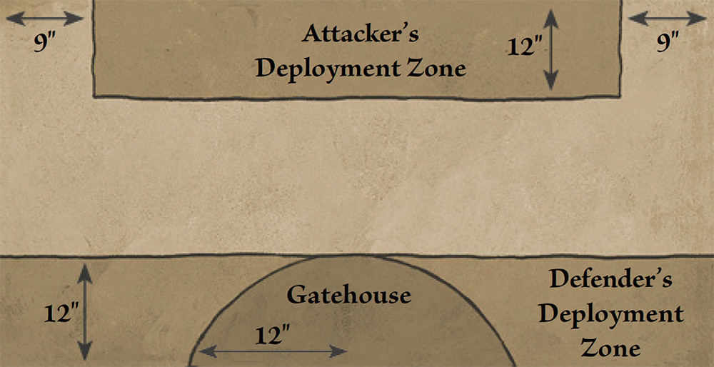 The Gatehouse: The gatehouse is an area of open ground that extends 12" from the centre of the southern board edge, as shown on the map opposite. Any units inside the gatehouse may re-roll failed Panic tests and Rally tests.