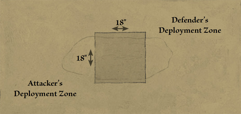Once the battlefield has been set up, the defender deploys their entire army within the 18" square defender's deployment zone, as shown on the map opposite. Once complete, the attacker deploys their army anywhere on the battlefield that is more than 8" away from any of the defender's models.