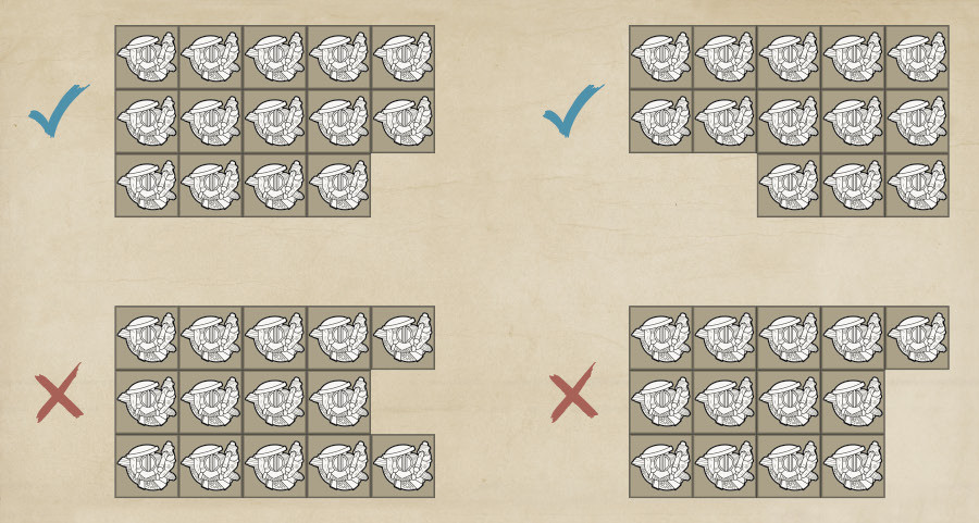 When removing casualties, models are always removed from one end of the back rank, either left to right or from right to left, as the owning player prefers, ensuring where possible that the remaining models are adjacent to one another, as shown in Fig 102.1.