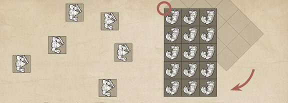 Once the charging unit has made contact with the target unit, it does not wheel to align. Instead, the Skirmishers must form up against the fighting rank of the charging unit, as shown in Fig 186.4 and Fig 186.5. However, no model in the charged unit can move further than its Movement characteristic. Any Skirmishers that cannot make base contact must instead form up behind the fighting rank.